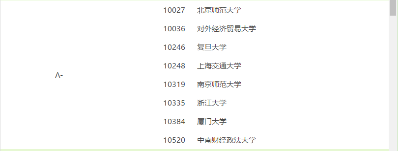 第三檔A-:北京師范大學、對外經濟貿易大學、復旦大學、上海交通大學、南京師范大學、浙江大學、廈門大學、中南財經政法大學。
