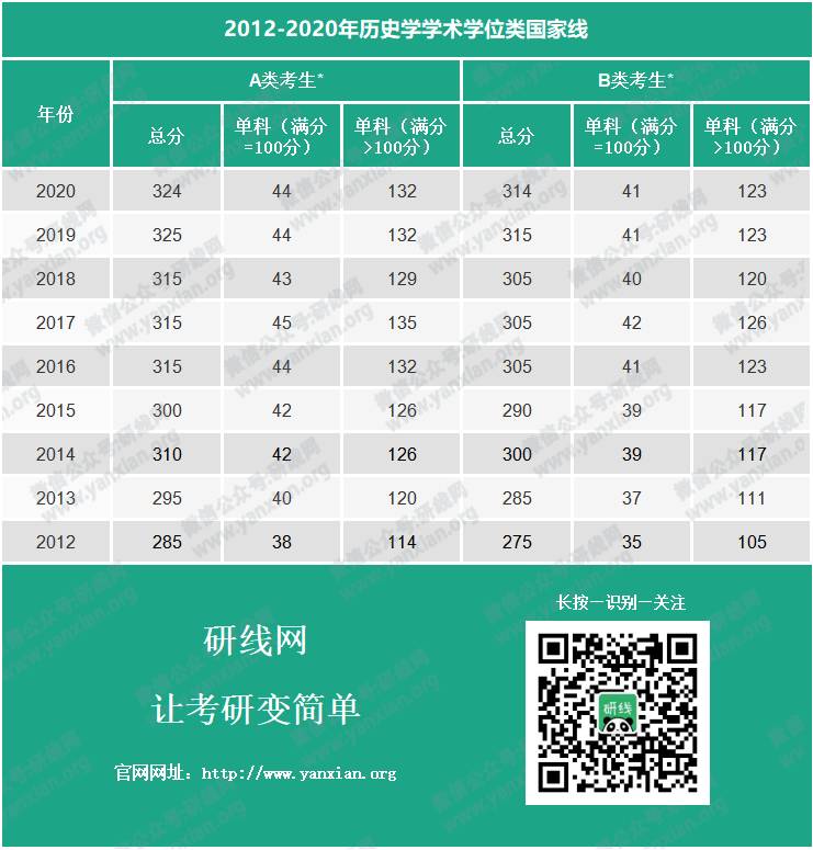 2012-2020年歷史學學術學位類國家線: