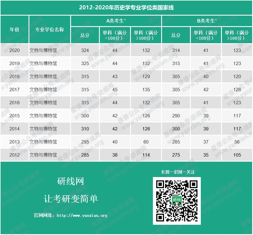 2012-2020年歷史學專業學位類國家線: