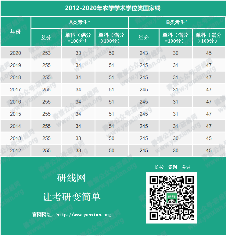 2012-2020年農學學術學位類國家線: