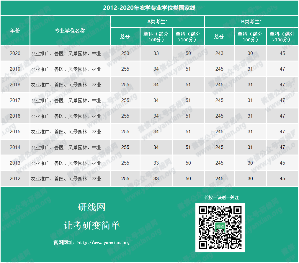 2012-2020年農學專業學位類國家線: