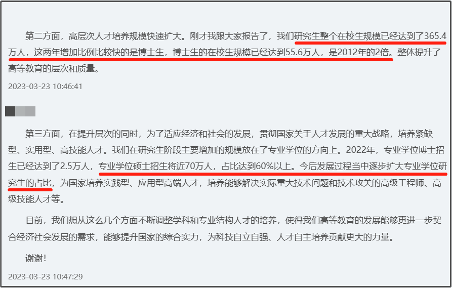 “2022年,專業(yè)學位博士招生已經(jīng)達到了2.5萬人,專業(yè)學位碩士招生將近70萬人,占比達到60%以上。今后發(fā)展過程當中逐步擴大專業(yè)學位研究生的占比。”