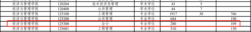 會計碩士報考人數為280;錄取人數為109,綜合計算,報錄比為:3:1