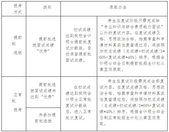 流程:個人申請——“提前批選拔”(專業知識與綜合素質能力面試)—— “提前批選拔”面試成績優秀——聯考報名(會計碩士非全日制)——網上或現場確認——參加全國聯考——復試(除“專業知識與綜合素質能力面試”以外的復試內容)——錄取。