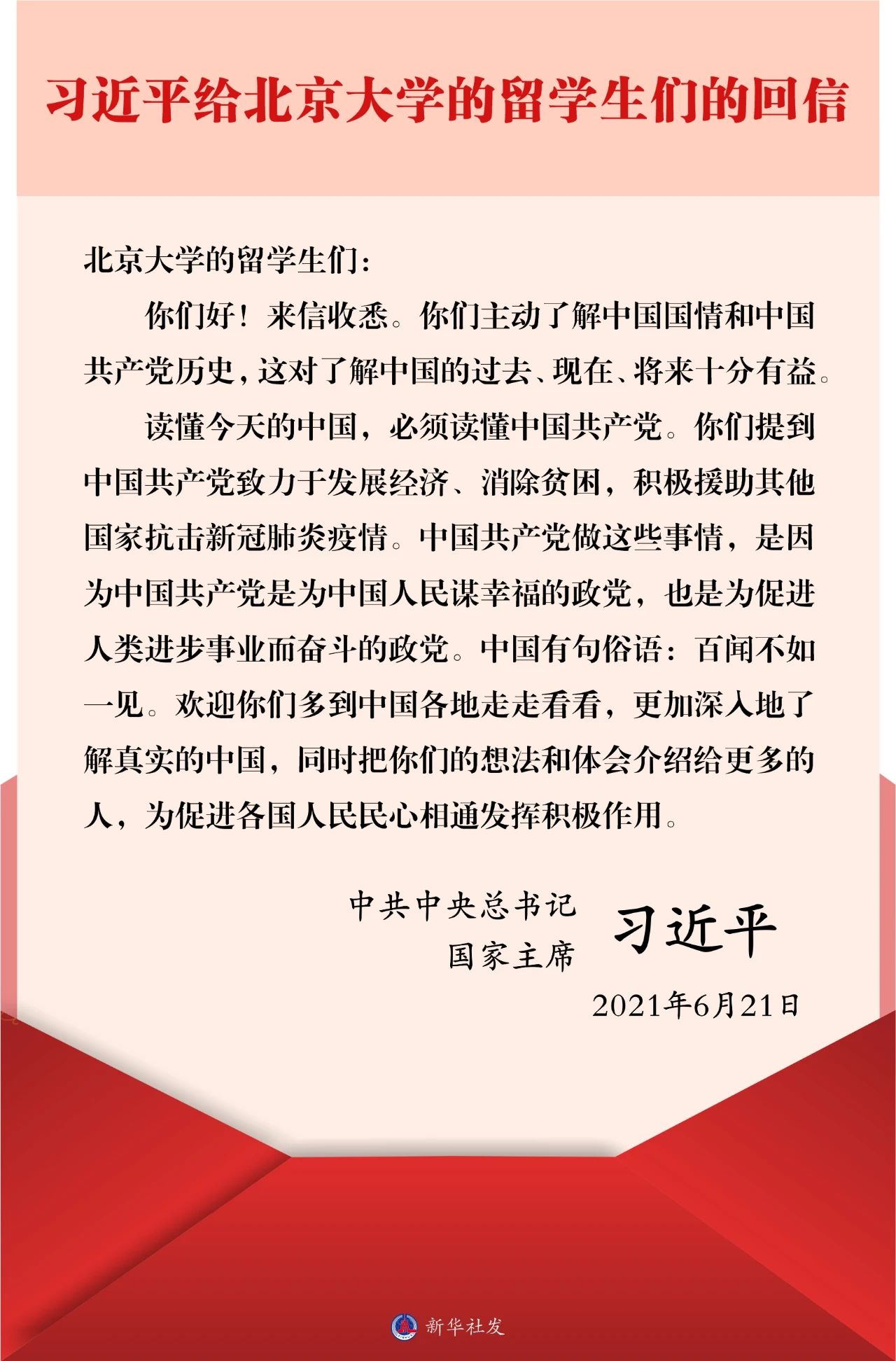 3.中共中央總書記、國家主席習近平6月21日給北京大學的留學生們回信,鼓勵他們更加深入地了解真實的中國,把想法和體會介紹給更多的人,為促進各國人民民心相通發揮積極作用。