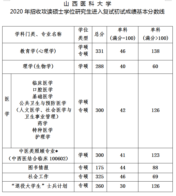 2020考研分數線:山西醫科大學2020年碩士研究生復試基本分數線公布!