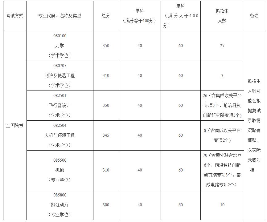 2. 我院080100力學(xué)、080705制冷及低溫工程、082501飛行器設(shè)計、082504人機與環(huán)境工程、085800能源動力等專業(yè)復(fù)試實行按專業(yè)和研究方向分組復(fù)試。