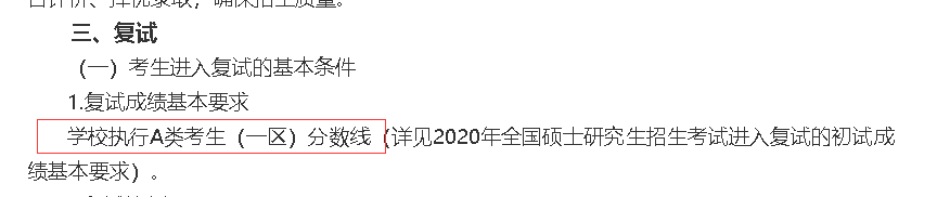 學校執行A類考生(一區)分數線(詳見2020年全國碩士研究生招生考試進入復試的初試成績基本要求)。