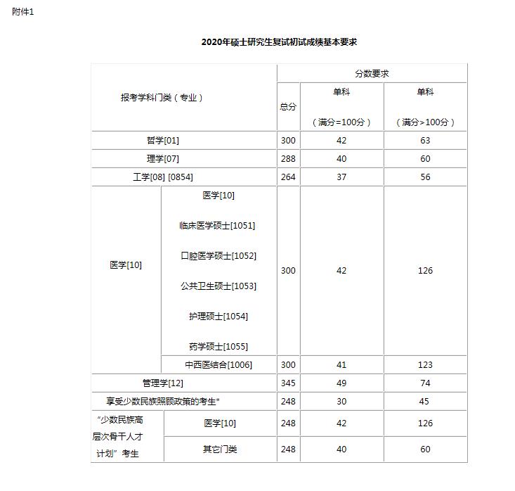 (2)參加“少數(shù)民族高層次骨干人才計(jì)劃”的考生:進(jìn)入復(fù)試的初試成績(jī)基本要求為總分不低于248分,同時(shí)單科成績(jī)達(dá)到相應(yīng)門類統(tǒng)招A類考生初試成績(jī)基本要求(附件1)。