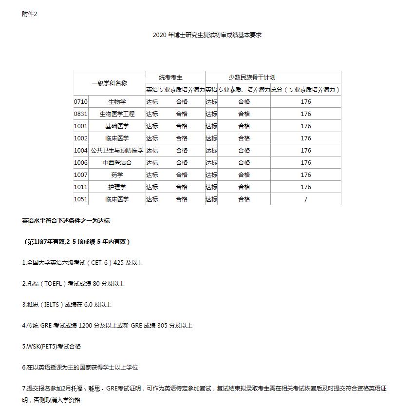 (1)參加全國(guó)統(tǒng)一入學(xué)考試考生(包括“退役大學(xué)生士兵”專項(xiàng)碩士研究生招生計(jì)劃):應(yīng)達(dá)到《2020年碩士研究生招生考試考生進(jìn)入復(fù)試的初試成績(jī)基本要求》(附件1)。