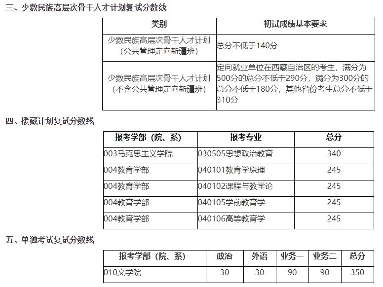 說明:此復試基本分數線只是我校復試的最低分數要求,接受報考的學部院系可根據整體考試情況、招生計劃、學科專業特點等,上調分數要求。考生須同時達到學校復試基本分數線和報考學部院系調整設定的復試分數線,才有資格參加復試。學部院系調整設定的復試分數線和復試辦法,另行通知。