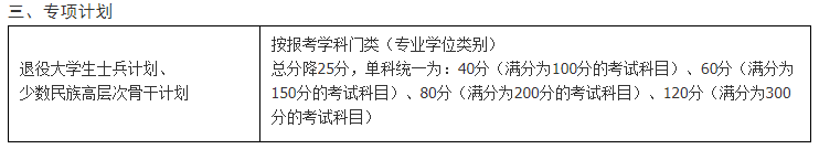 (2)高校學(xué)生應(yīng)征入伍服現(xiàn)役退役,達(dá)到報考條件后,3年內(nèi)參加全國碩士研究生招生考試的考生,初試總分加10分,同等條件下優(yōu)先錄取。納入“退役大學(xué)生士兵”專項(xiàng)計(jì)劃招錄的,不再享受退役大學(xué)生士兵初試加分政策。