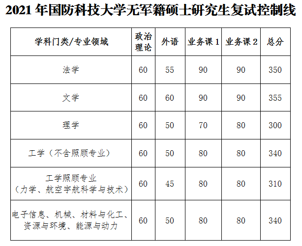 現(xiàn)公布國防科技大學(xué)2021年無軍籍碩士研究生招生復(fù)試控制線,軍人碩士研究生招生復(fù)試控制線待上級政策明確后公布。