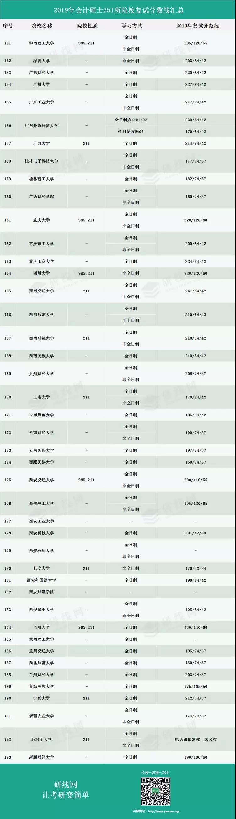 研線網(wǎng)今天為大家整理了“2019年會計專碩(MPAcc)251所院校復試分數(shù)線匯總”,希望能幫助到各位報考會計專碩的小伙伴!