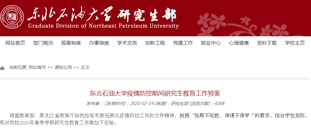 根據教育部、黑龍江省教育廳和我校有關新冠肺炎疫情防控工作的文件精神,按照“延期不延教、停課不停學”的要求,結合學校實際,現對我校2020年春季學期研究生教育工作做如下安排: