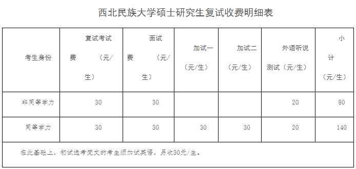 考生須按照《甘肅省發展和改革委員會、甘肅省財政廳關于大中專院校招生報名費等收費標準的批復》(甘發改收費〔2010〕1915號)文件要求繳納復試費。具體收費標準為每生每科30元、外語聽說測試20元。