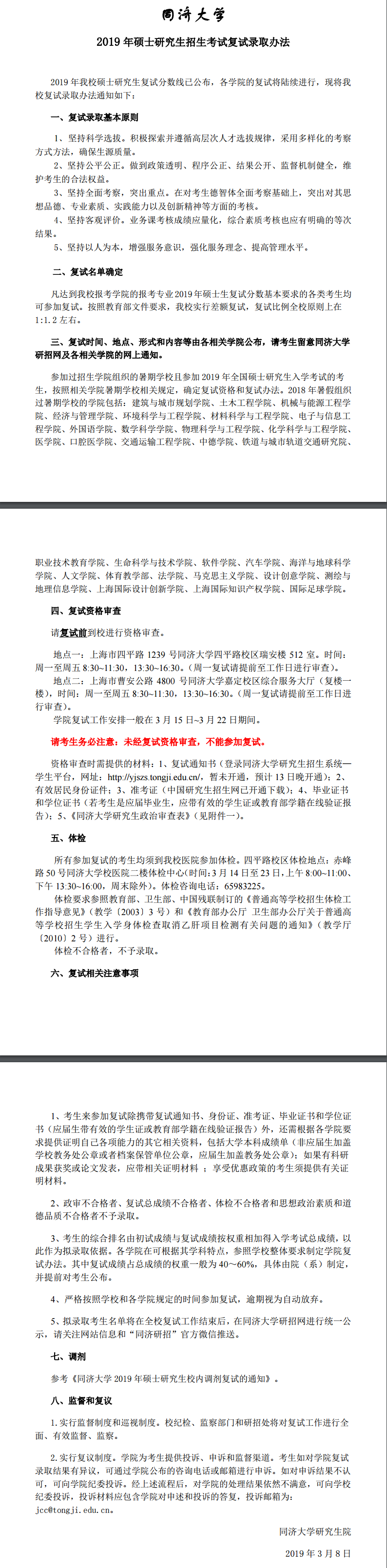 以上就是研線網整理的“同濟大學2019年碩士研究生招生考試復試錄取辦法”相關內容,更多考研復試盡在考研復試公告欄目,研線網祝同學們考研成功!