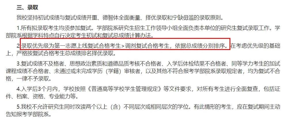 錄取優(yōu)先級為第一志愿上線復(fù)試合格考生>調(diào)劑復(fù)試合格考生,依據(jù)總成績分別排序。在考慮優(yōu)先級的基礎(chǔ)上,嚴(yán)格按復(fù)試合格考生總成績排名擇優(yōu)錄取。