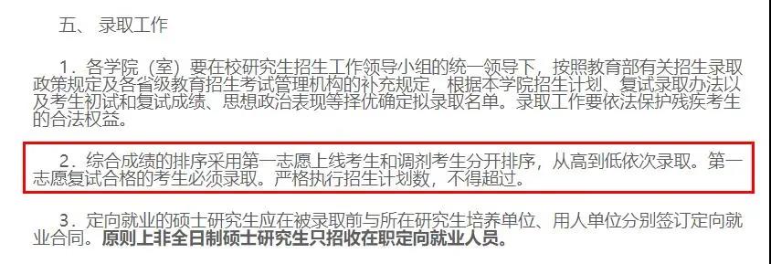 綜合成績的排序采用第一志愿上線考生和調(diào)劑考生分開排序,從高到低依次錄取。第一志愿復(fù)試合格的考生必須錄取。嚴(yán)格執(zhí)行招生計劃數(shù),不得超過。