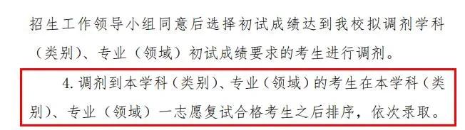 調(diào)劑到本學(xué)科(類別)、專業(yè)(領(lǐng)域)的考生在本學(xué)科(類別)、專業(yè)(領(lǐng)域)一志愿復(fù)試合格考生之后排序,依次錄取。