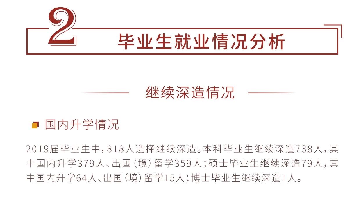 注:就業率=(國內升學+出國(境)留學+簽約工作+靈活就業+自主創業+項目就業)人數/畢業生總人數X100%;直接工作包括簽約工作、靈活就業、自主創業、項目就業畢業生;繼續深造包括國內升學和出國(境)留學畢業生;國內升學包括已上博士后、已上博、已上碩、已上二學位、已升普通本科和成人本科畢業生;簽約工作包括出國工作、簽就業協議、簽勞動合同畢業生;靈活就業包括單位用人證明和自由職業畢業生;項目就業包括志愿服務西部、國家漢語教師、參軍入伍、三支一扶畢業生。