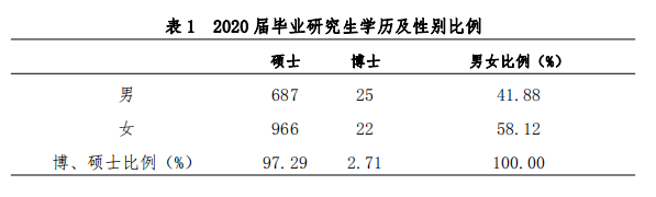 (1)畢業(yè)生人數(shù)及男、女比例 我校 2020 屆畢業(yè)研究生共計(jì) 1700 人(未包含 12 月份畢業(yè)人數(shù)), 其中博士畢業(yè)生 47 人,碩士畢業(yè)生 1653 人,分別占比 2.76%、97.24%。 畢業(yè)生男生、女生各占 41.88%、58.12%,參見表 1。