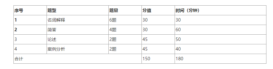 本考試包括三個(gè)部分:名詞解釋、簡答、論述、案例分析。總分150分。