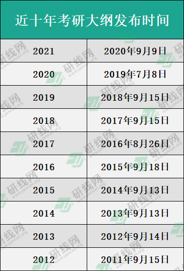 2021年自命題科目考研大綱發布時間由院校自主決定!一般是7月到9月,不同院校發布的時間并不完全一致,大家可參考去年考試大綱的發布時間來確定時間。據往年經驗,考試大綱和招生目錄一般會一起發布!