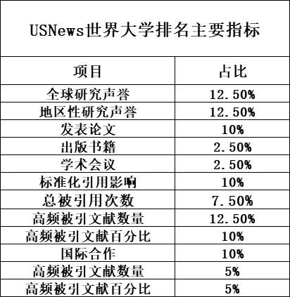 今年USNews世界大學排名主要指標如圖所示