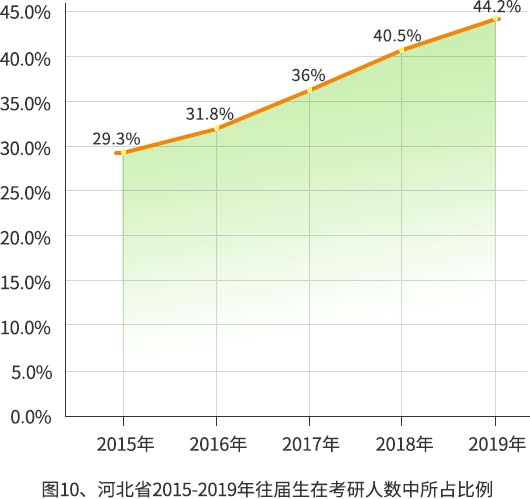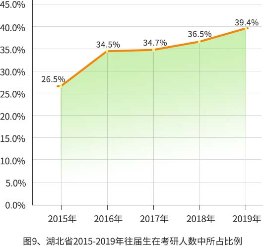 根據下圖湖北省、河北省2015-2019年往屆生在考研人數中所占比例可以看出,往屆生選擇考研的越來越多。
