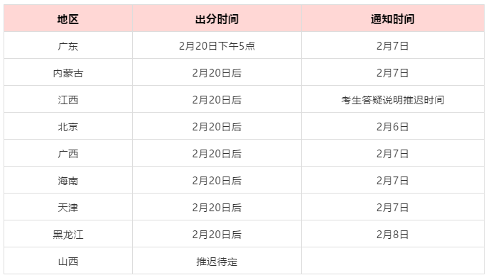 此外,還有廣東、內蒙古、江西、北京、廣西等省市初試成績公布時間調整到2月20日后。