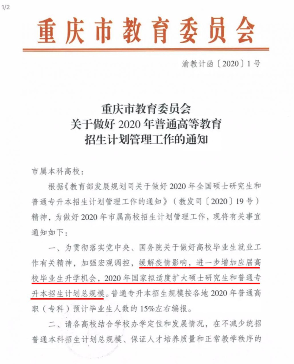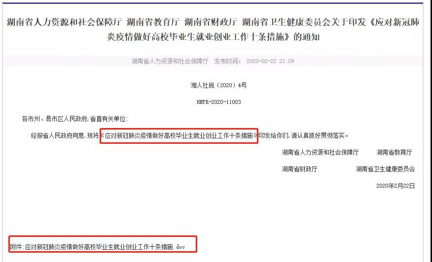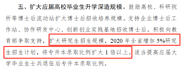 此前,2月22日,湖南省人力資源和社會保障廳曾發布《應對新冠肺炎疫情做好高校畢業生就業創業工作十條措施》,第五條“積極向教育部爭取支持,擴大研究生招生規模,2020年全省增加5%研究生招生計劃,將專升本錄取比例擴大1倍以上。