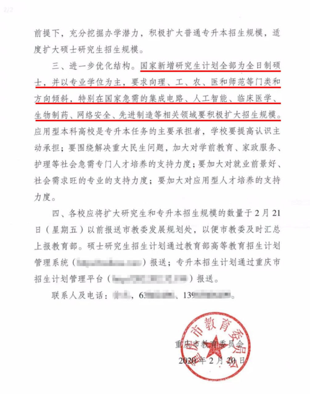 重慶市教育委員會的文件稱2020年國家擬適度擴大碩士研究生招生計劃總規模:要求擴招的全部是全日制,并以專碩為主,擴招專業主要集中于:理、工、農、醫和師范類,特別是國家急需的集成電路、人工智能、臨床醫學、生物制藥、網絡安全、先進制造等領域。