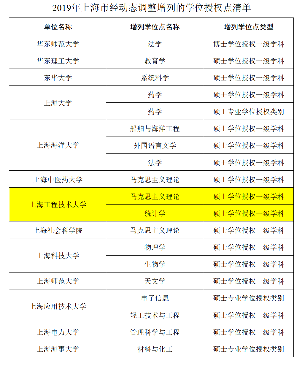 3月30日,國務院學位委員會發布了《國務院學位委員會關于下達2019年動態調整撤銷和增列的學位授權點名單的通知》(學位〔2020〕3號), 其中上海工程技術大學獲批增列馬克思主義理論、統計學2個一級學科碩士學位授權點。此次授權填補了我校法學和理學兩大學科門類碩士研究生培養的空白,學科布局進一步優化,研究生教育內涵式發展、教學型大學向教學研究型大學轉變又邁上了新臺階。