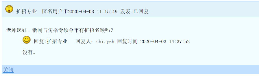 在西安交通大學研究生招生網的招生咨詢板塊中,官網已經回復復試分數線發布時間,同時研線網還發現涉及擴招的問題也已經得到官方回復,比如:醫學部分專業會有擴招,新聞與傳播專碩不會擴招等。