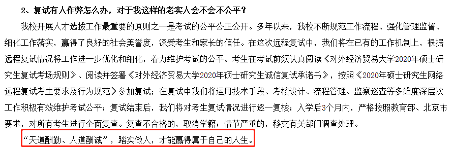 近段時間各大院校復(fù)試公告頻出,但是這類復(fù)試階段常見問題暖心解答卻少之又少。對外經(jīng)濟(jì)貿(mào)易大學(xué)的《解答》在內(nèi)容上雖然有點(diǎn)皮,但也看出院校在特殊時期對考生的關(guān)懷和安撫。