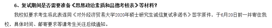 4.《思想政治素質(zhì)和品德考核表》等材料與連同《對外經(jīng)濟(jì)貿(mào)易大學(xué)2020年碩士研究生誠信復(fù)試承諾書》簽字原件,于6月20日前一并寄往我校。