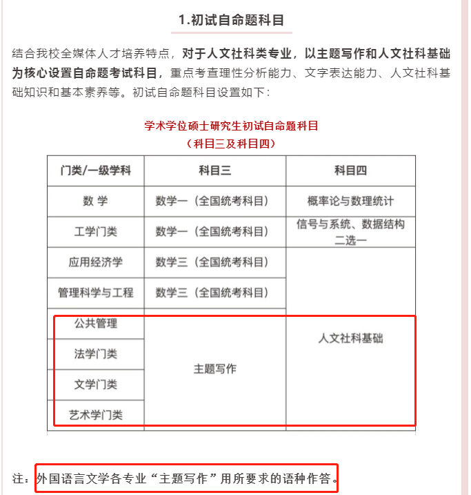 從最新的考試大綱看,中傳2021年碩士研究生進行一次大改革,從原來的各個學科考各個學科的專業課變成公共管理、法學門類、藝術學門類、文學門類科目三考主題寫作,科目四考應用基礎。應用經濟學、管理科學與工程科目四也為人文社科基礎。