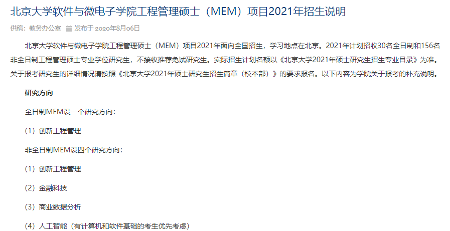 北京大學軟件與微電子學院公布工程管理碩士2021年招生說明,2021年計劃招收30名全日制和156名非全日制工程管理碩士專業學位研究生,不接受推免研究生。
