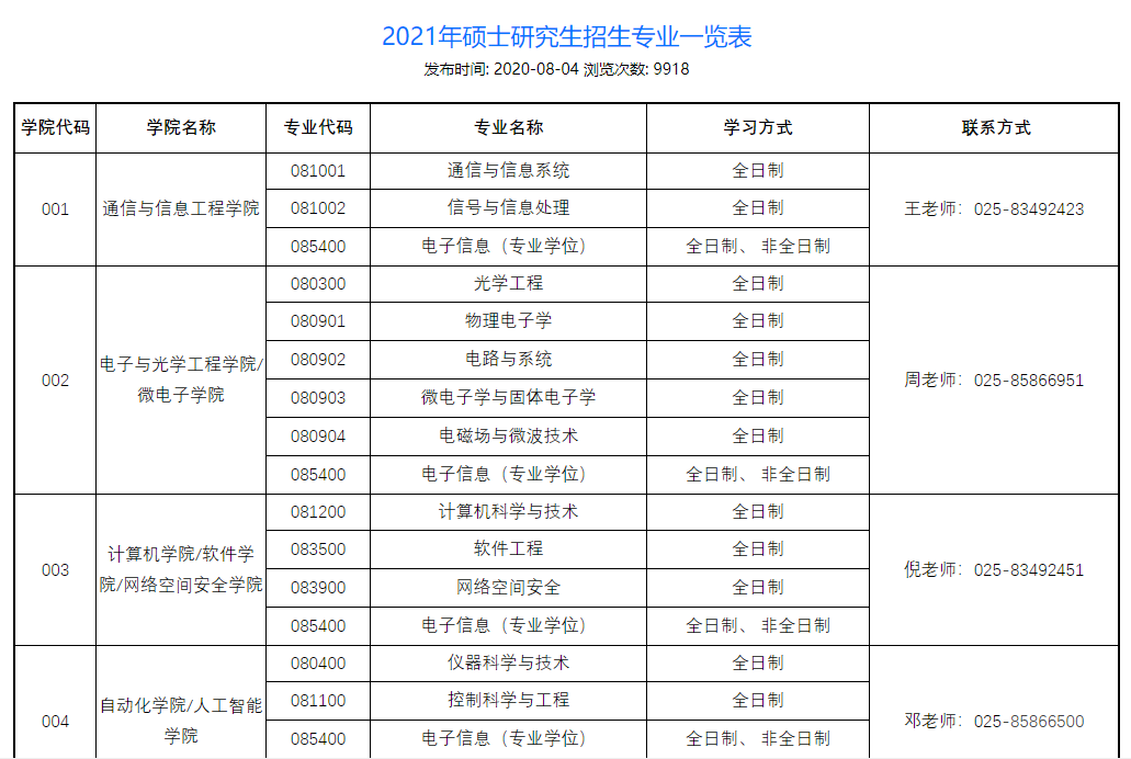 南京郵電大學公布2021年碩士研究生招生科目專業目錄。