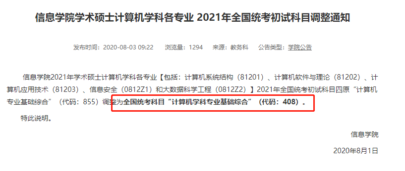 中國人民大學信息學院公布學術碩士計算機學科各專業2021年全國統考初試科目調整通知,其中全國統考科目四原“計算機基礎綜合”(代碼855)調整為全國統考科目“計算機學科專業基礎綜合”(代碼408)。