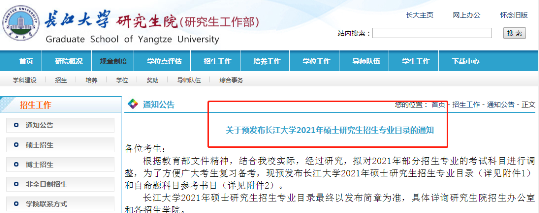 長江大學發布《關于預發布長江大學2021年碩士研究生招生專業目錄的通知》