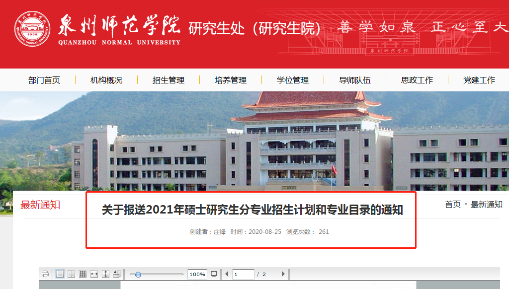 泉州師范大學發布《關于報送2021年碩士研究生分專業招生計劃和專業目錄的通知》。