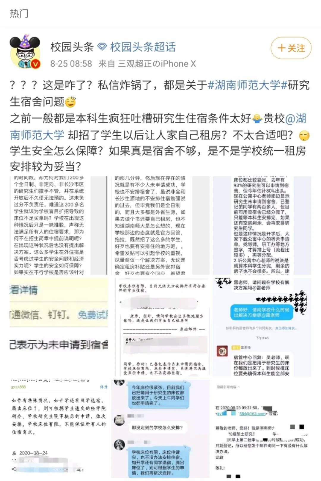 湖南師范大學研究生宿舍床位緊張,部分研究生未申請到床位,就此事向微博博主投稿,表示校方用“官方的回答了他的廢話”,希望能夠得到實際的解決。
