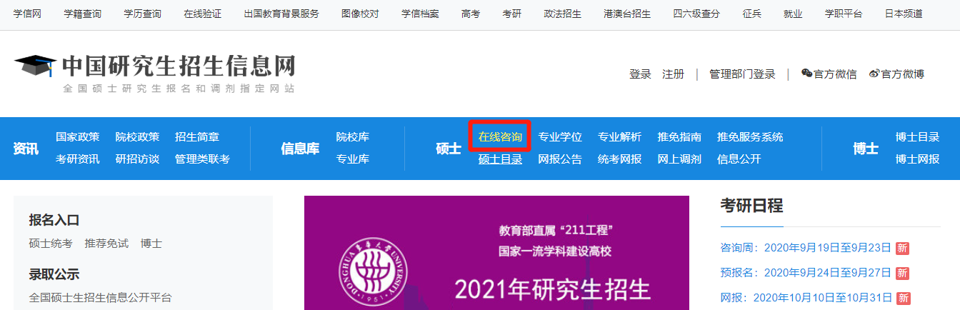 1、登錄研招網(https://yz.chsi.com.cn/),選擇“在線咨詢”欄目。