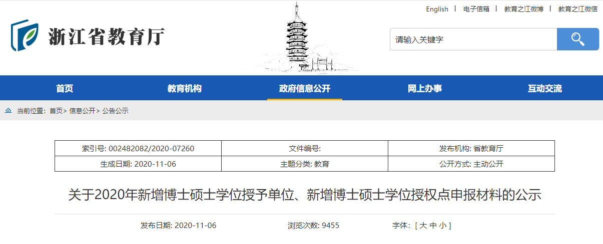 根據《博士碩士學位授權審核辦法》(學位〔2017〕9號)及《國務院學位委員會關于開展2020年博士碩士學位授權審核工作的通知》(學位〔2020〕22號)要求,現將2020年我省新增博士碩士學位授予單位、新增博士碩士學位授權點申報材料予以公示,公示時間為2020年11月6日至2020年11月8日。