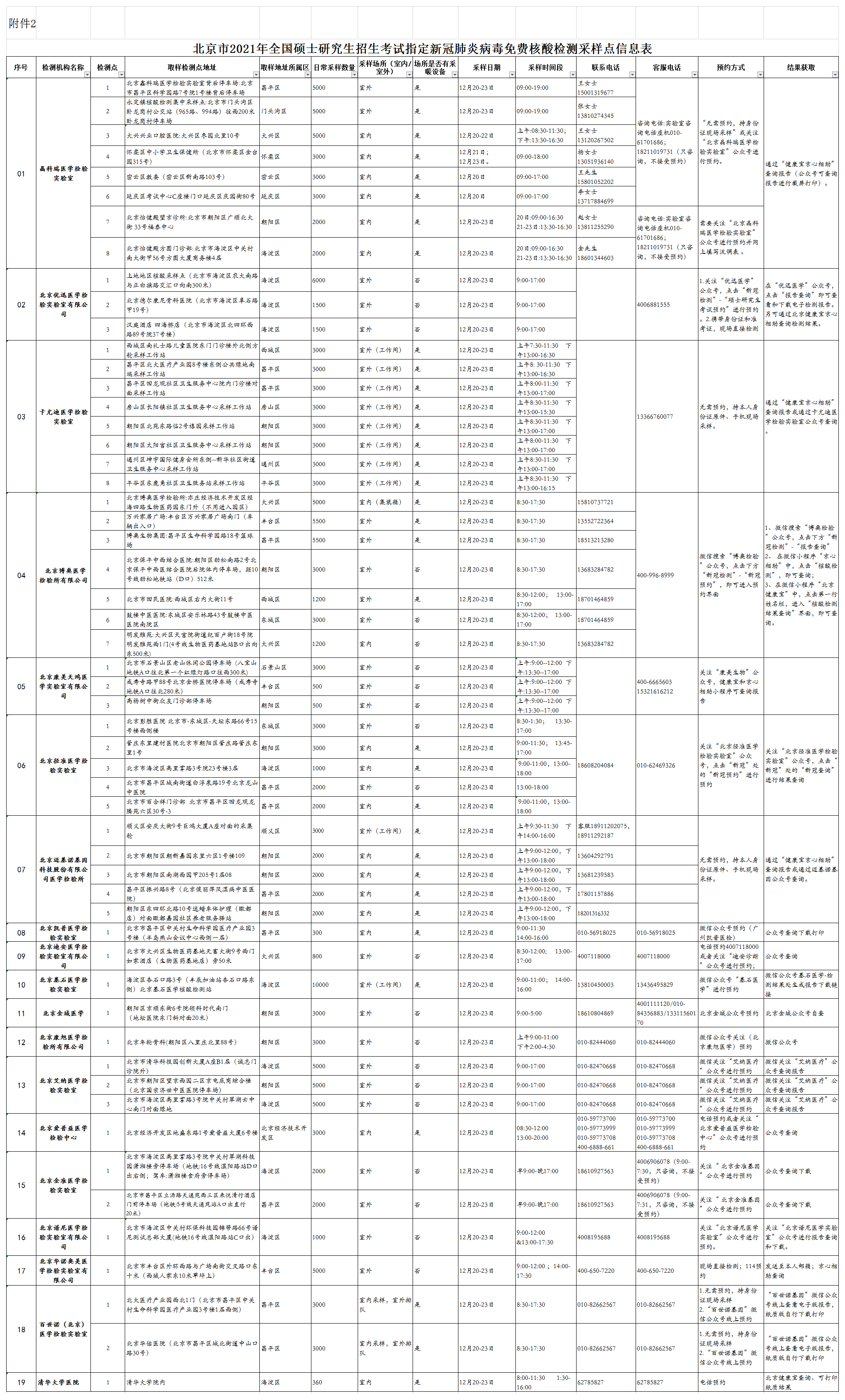 附件北京市2021年全國碩士研究生招生考試指定新冠肺炎病毒免費核酸檢測采樣點信息表