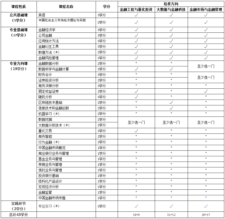 備注:1)打對號者為該方向必修課,打星號者為該方向選修課。對于每個方向,公共基礎課、專業基礎課和方向必修課均為必修課程。學生必須選擇一個方向,且修滿該方向規定的必修和選修學分。2)課程可能會有增補與調整,以開學實際開課計劃為準。 3)帶#的課程為Olin商學院認可學分的課程(其中,行為金融、機器學習、大數據分析技術三門課中只能選擇一門作為認可課程)