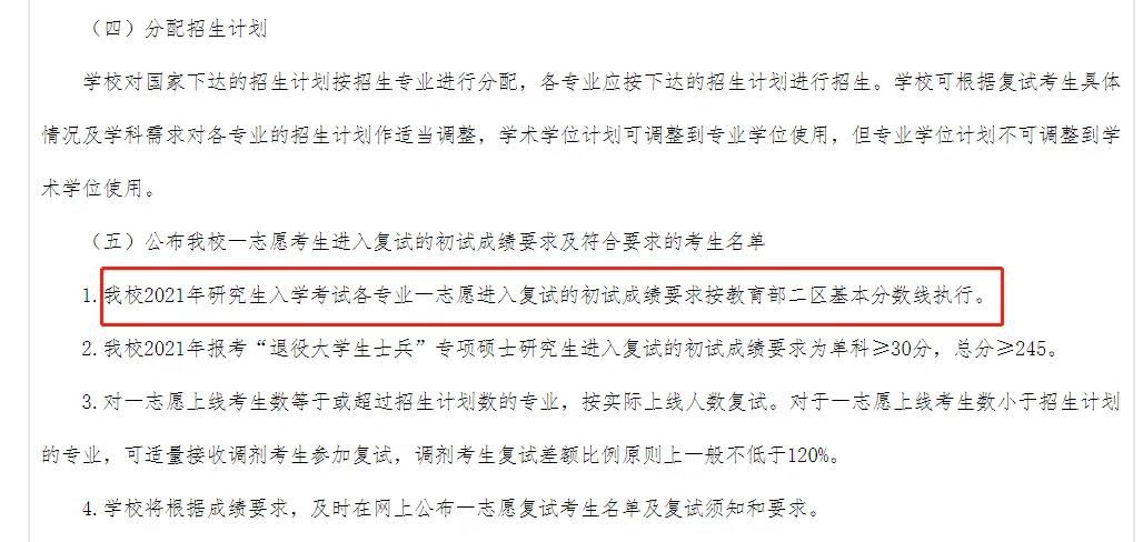 “我校2021年研究生入學考試各專業一志愿進入復試的初試成績要求按教育部二區基本分數線執行。”