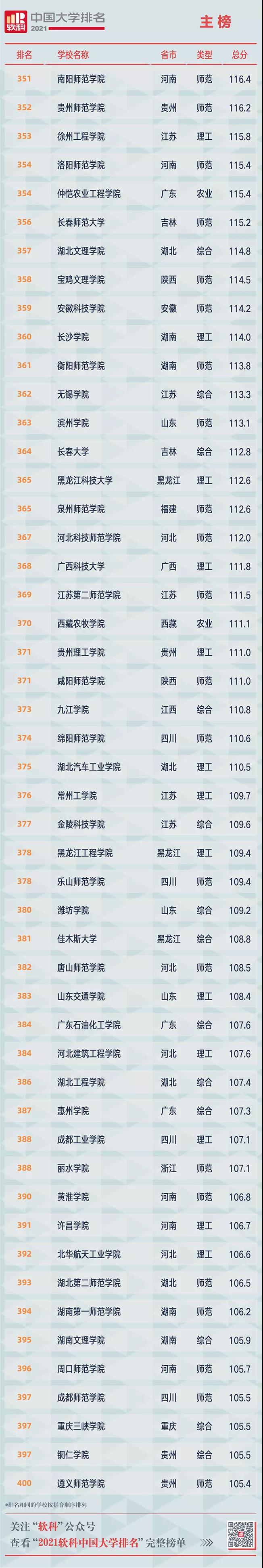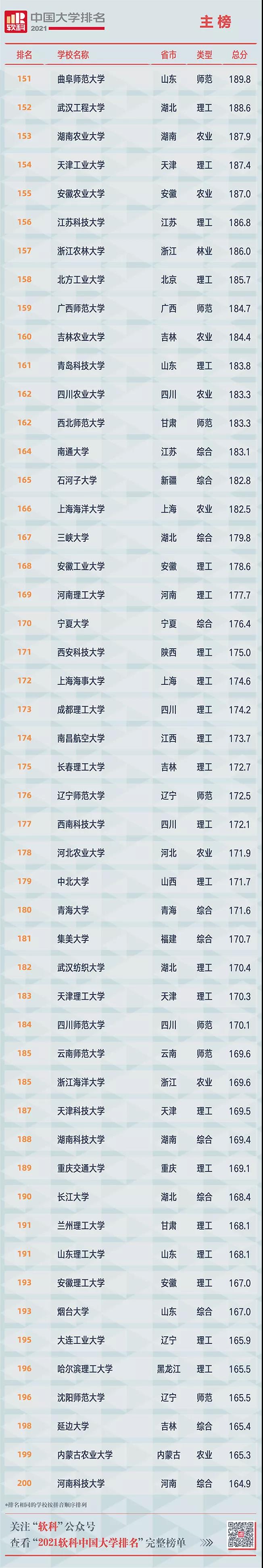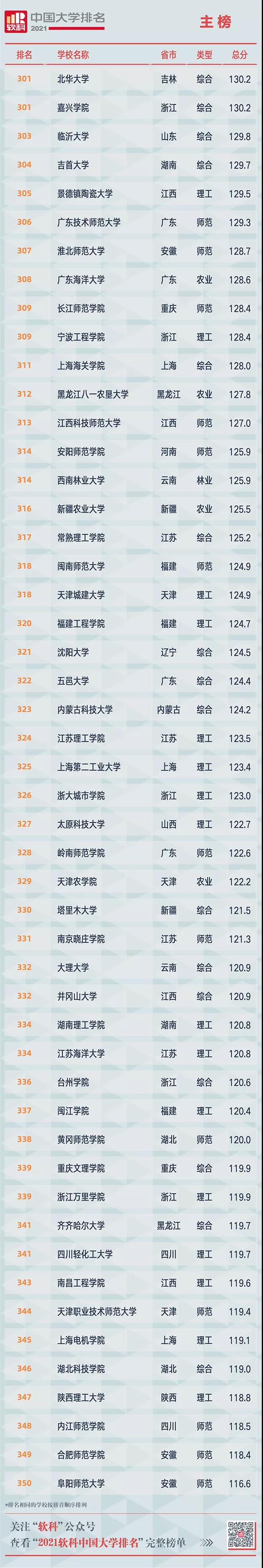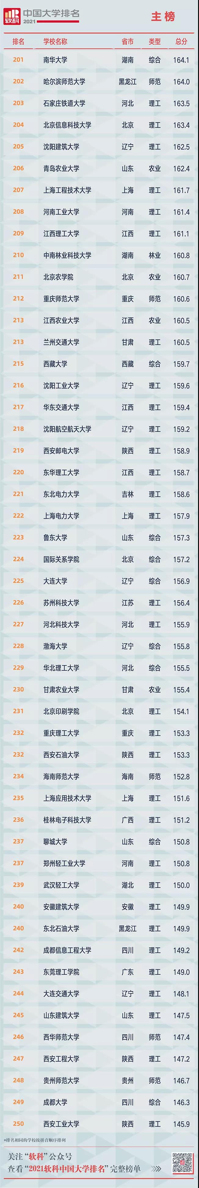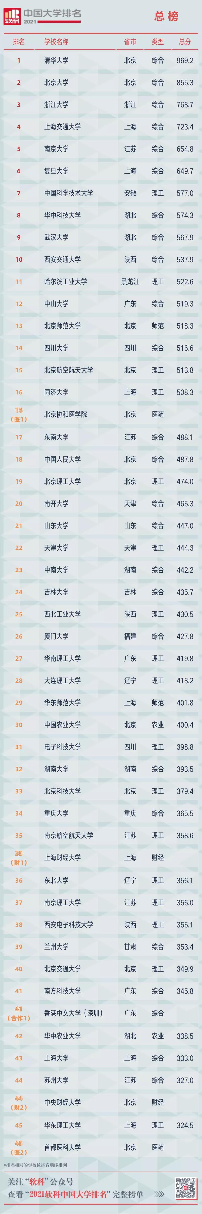 2021軟科中國大學排名(主榜)的上榜高校共有582所,清華大學、北京大學、浙江大學占據前三,上海交通大學、南京大學位列全國前五。其他位列全國前十名的大學依次為復旦大學(第六)、中國科學技術大學(第七)、華中科技大學(第八)、武漢大學(第九)、西安交通大學(第十)。西安交通大學相較2020年排名上升1名,首次入圍全國十強。西安交通大學堅持“扎根西部、服務國家、世界一流”的辦學定位,建設世界一流研究型大學的愿景已現曙光。